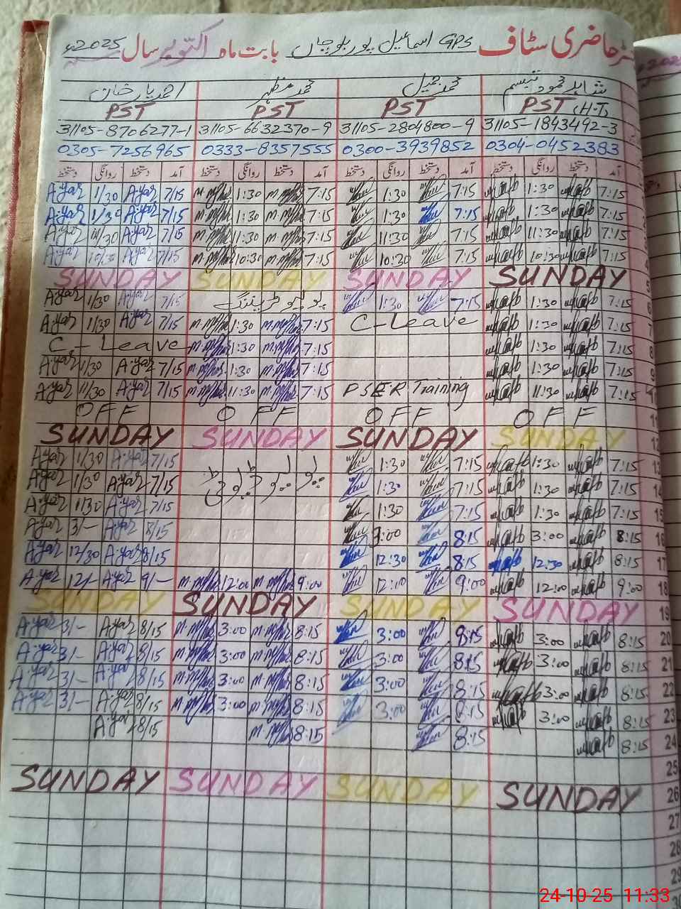 | CNIC | Full Name | Designation | R/C | Absence During Last Calender Month |