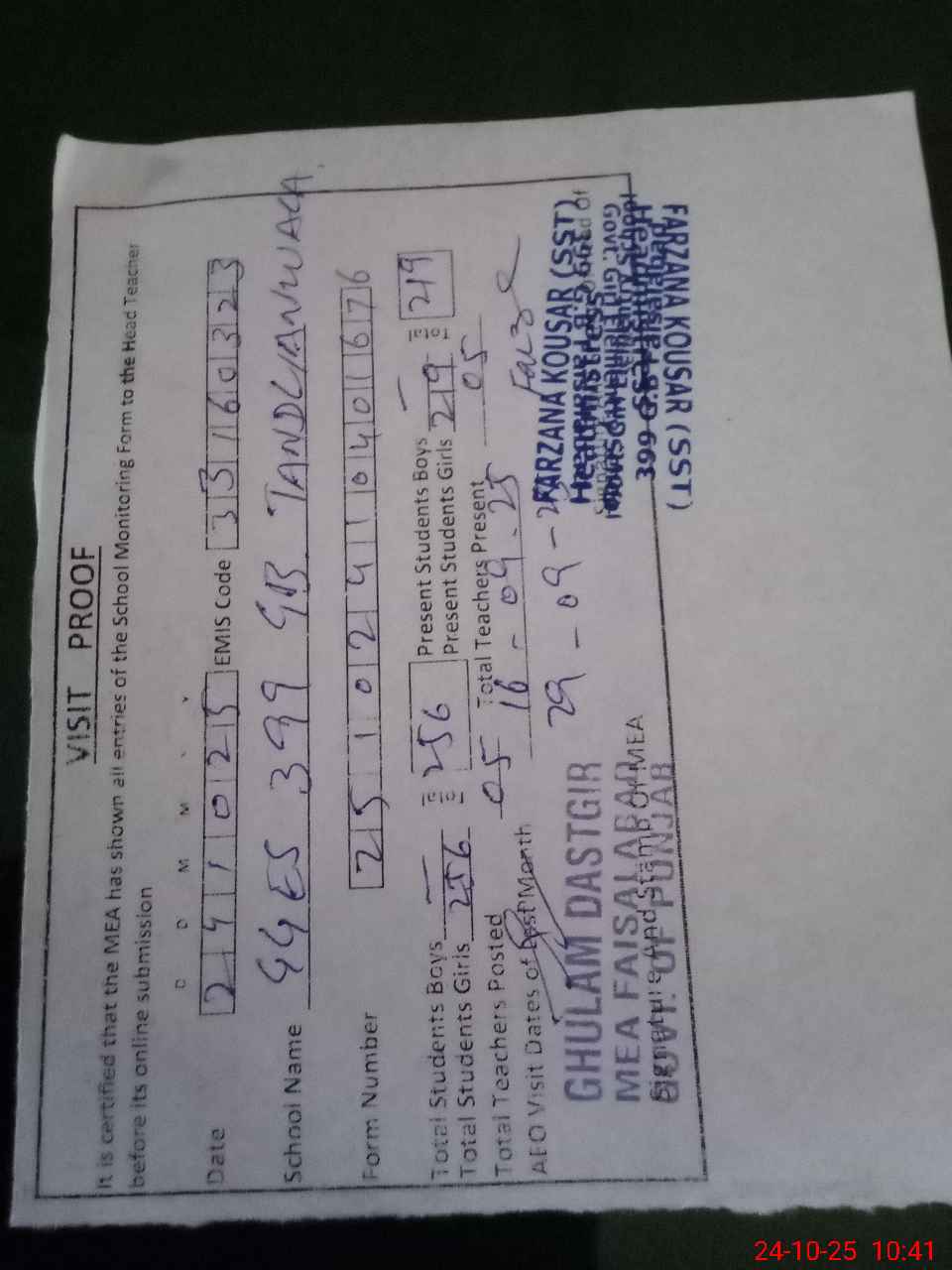| Certified that this School was Inspected by the Undersigned MEA/DMO Today and the Information Stated Above is as Per Record. | |||||