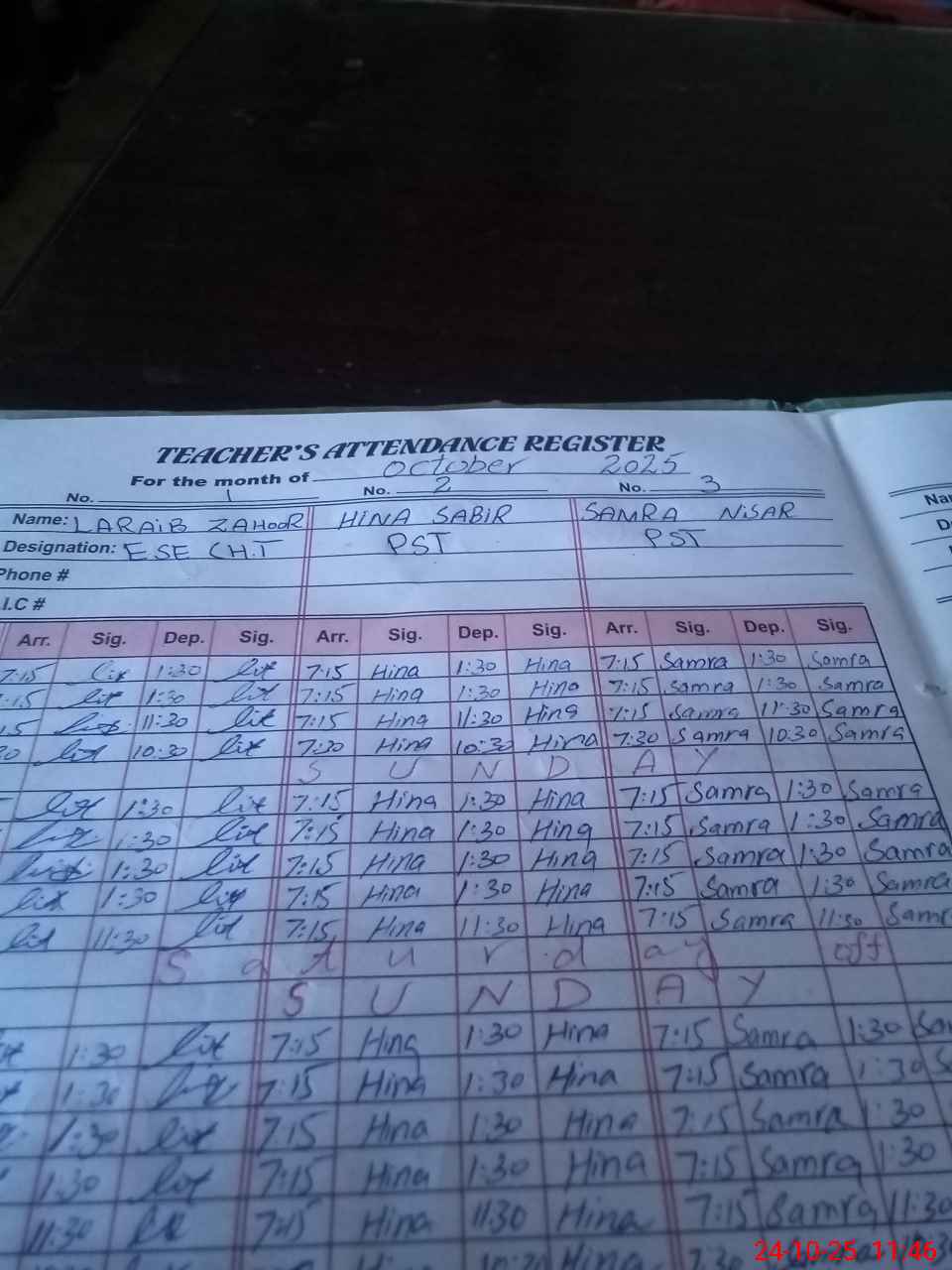 | CNIC | Full Name | Designation | R/C | Absence During Last Calender Month |