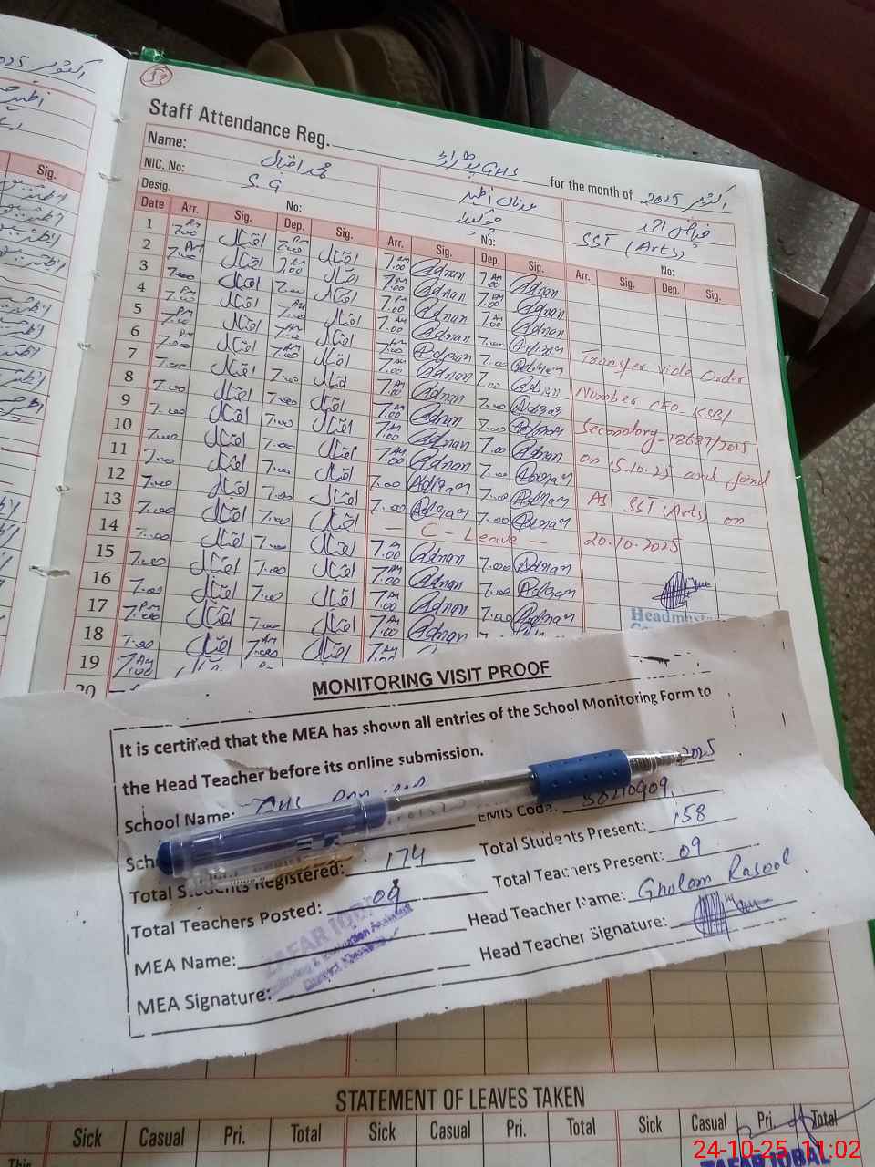 | Attendance Register | Head Teacher | MEA with School | Visit Proof |