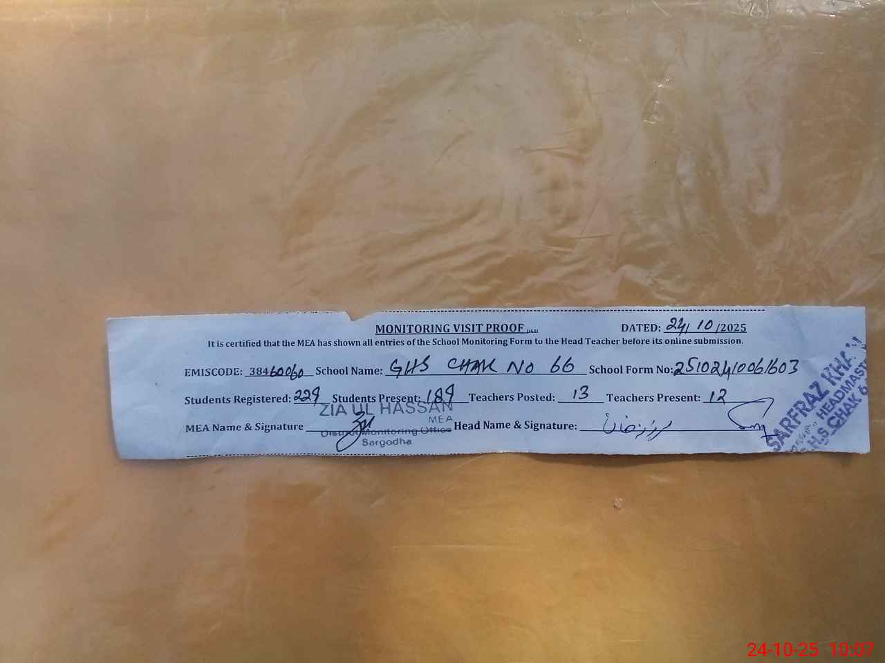 | Certified that this School was Inspected by the Undersigned MEA/DMO Today and the Information Stated Above is as Per Record. | |||||