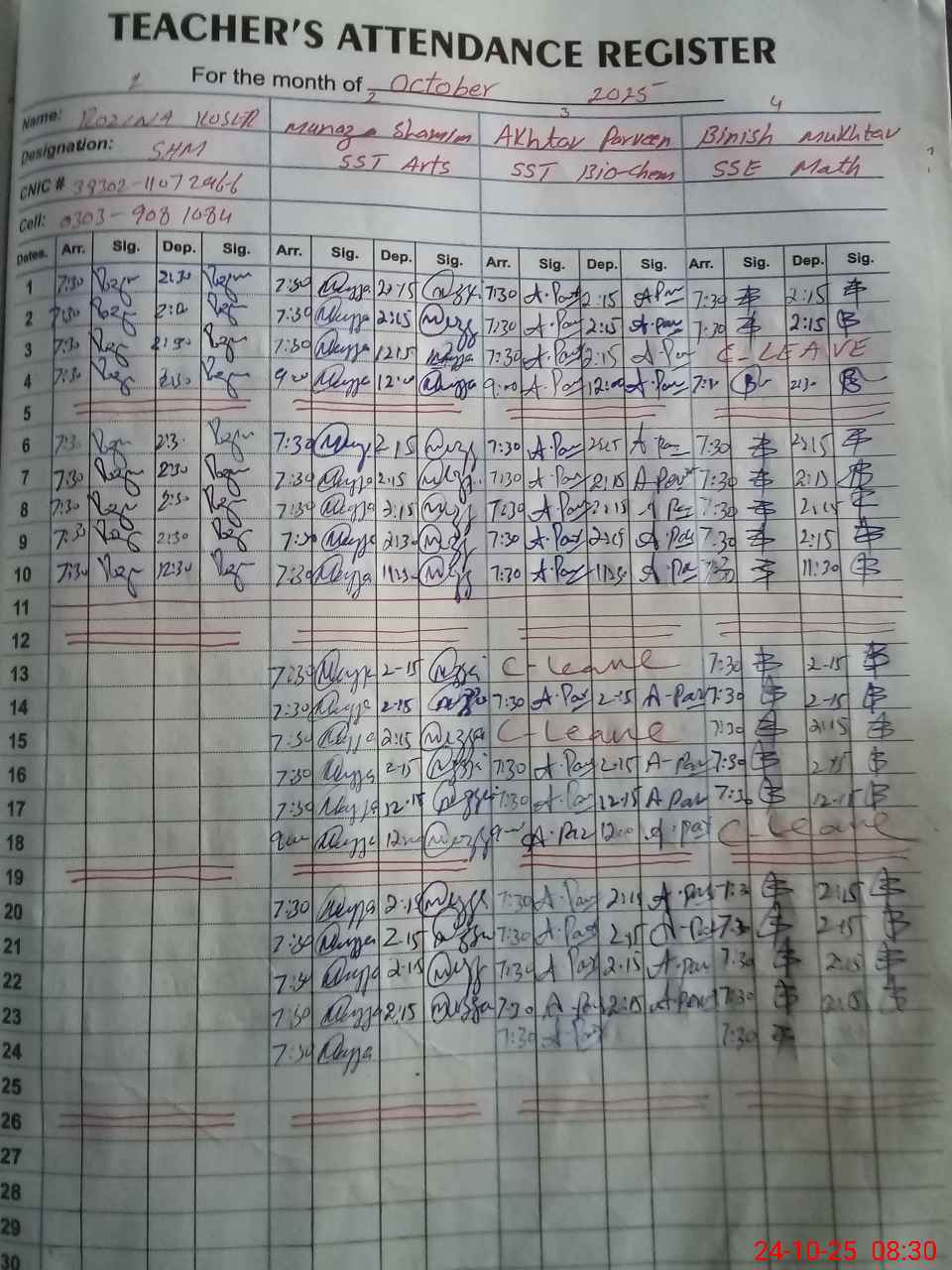 | CNIC | Full Name | Designation | R/C | Absence during last cal. month |