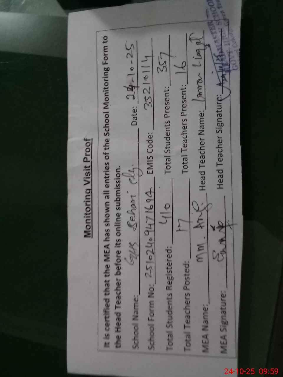 | EMIS Code: 35210114 | Name of School: GHS BAHARI COLONY GREEN TOWN(Newly upgraded) | |||