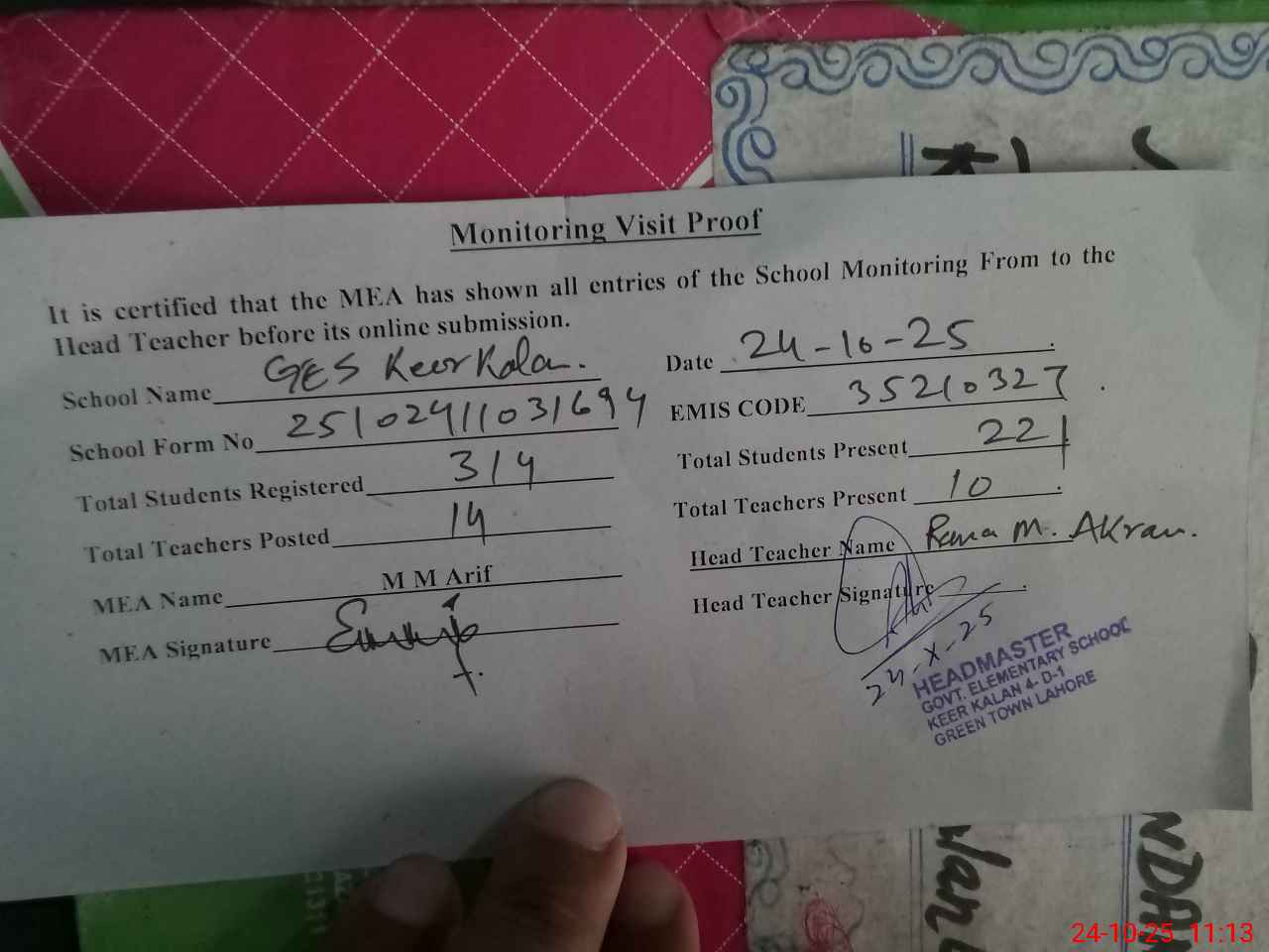 | Certified that this School was Inspected by the Undersigned MEA/DMO Today and the Information Stated Above is as Per Record. | |||||