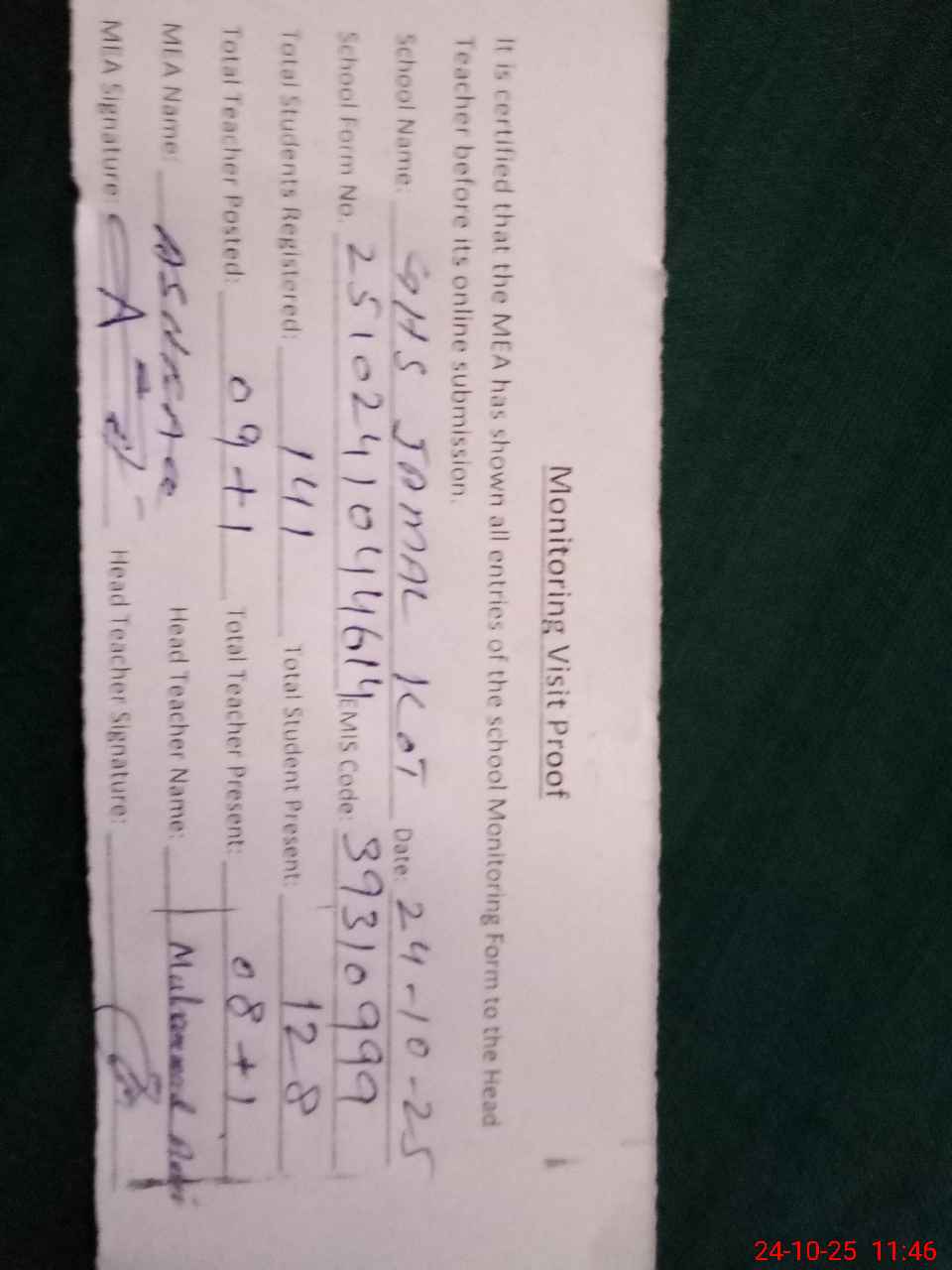 | Attendance Register | Head Teacher | MEA with School | Visit Proof |