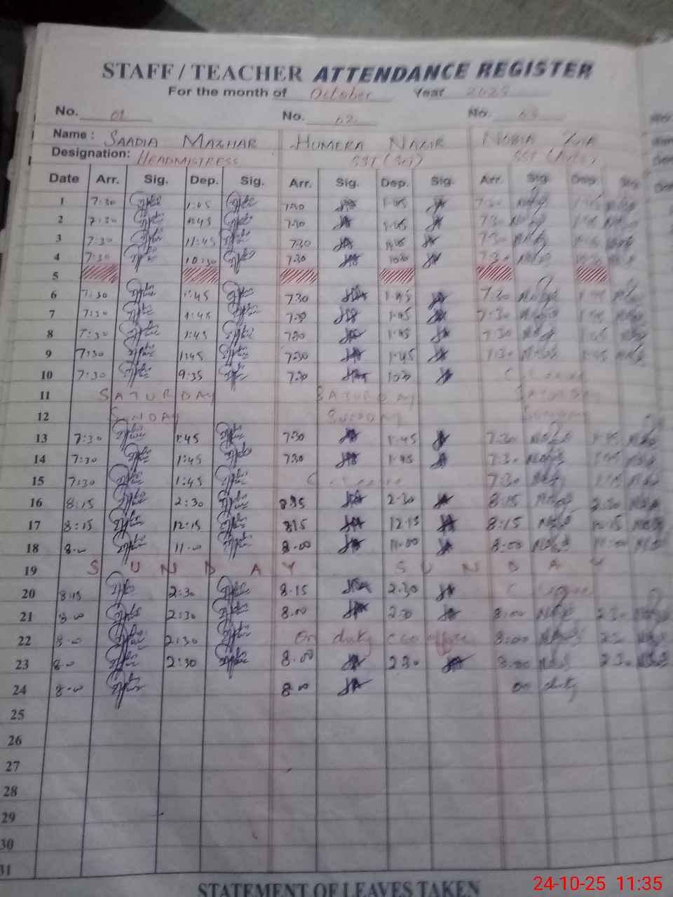 | Leave | Duty | Absent | Maternity | Medical | Ex- Pak |