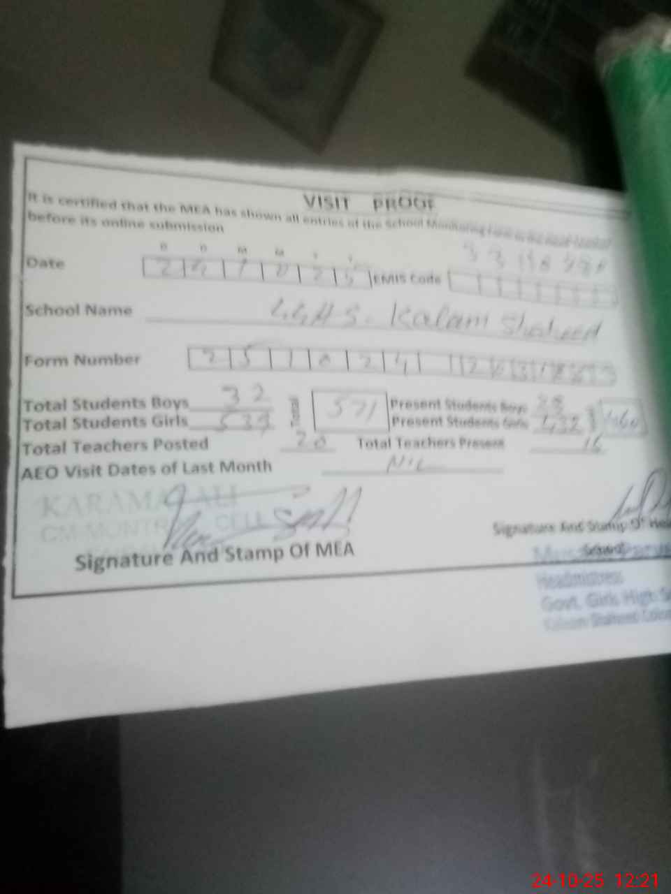 | Attendance Register | Head Teacher | MEA with School | Visit Proof |