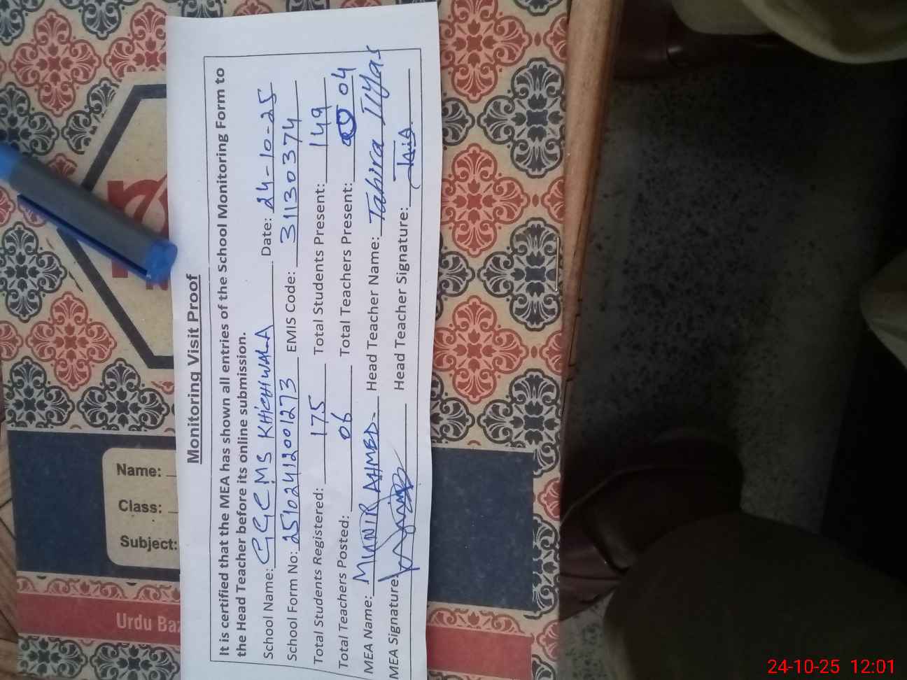 | EMIS Code: 31130374 | Name of School: GGCMS KHICHIWALA | |||