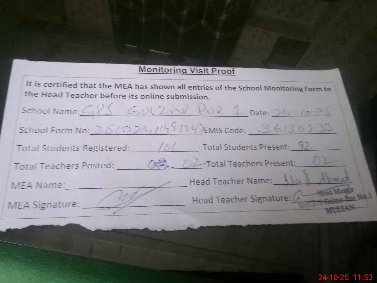 | Attendance Register | Head Teacher | MEA with School | Visit Proof |