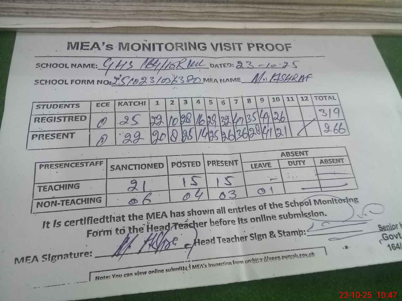 | EMIS Code: 36420012 | Name of School: GHS 164/10-R, KHANEWAL | |||