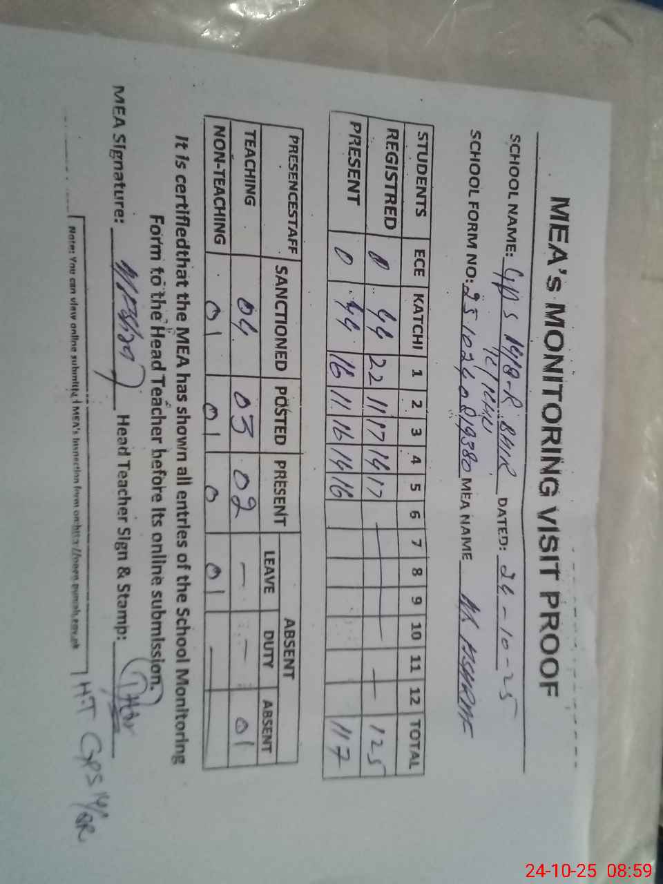 | Attendance Register | Head Teacher | MEA with School | Visit Proof |