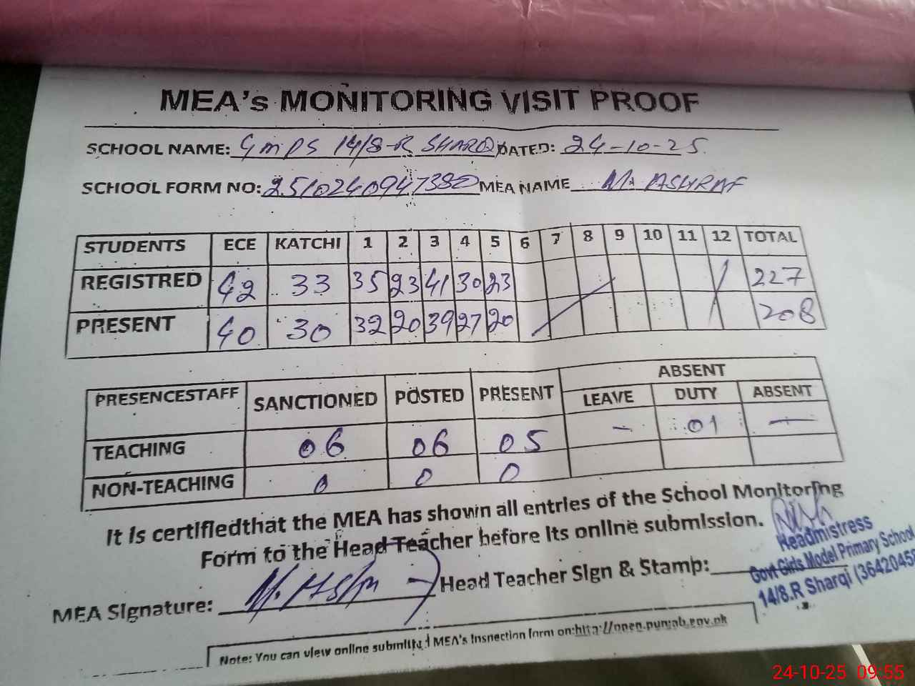 | Attendance Register | Head Teacher | MEA with School | Visit Proof |
