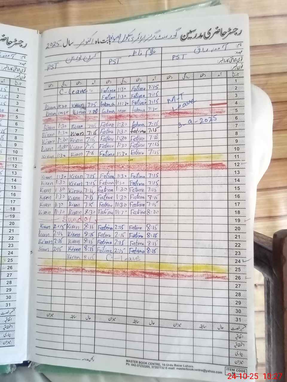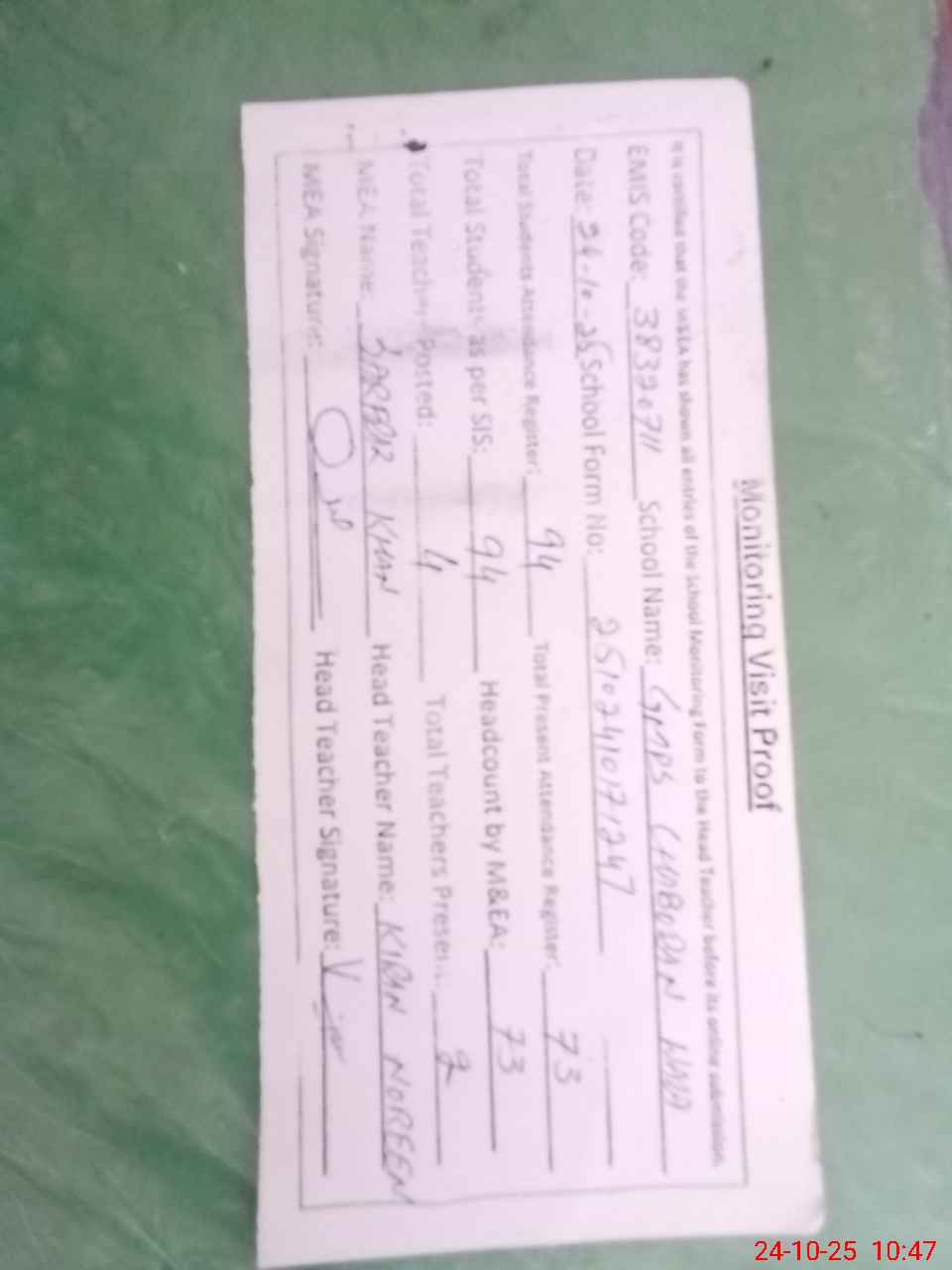 | Total no. of Classrooms: 3 No. of Classrooms Used for Teaching: 3 No. of Classrooms Storing Old Furniture, FTBs, etc: 0Comments if Any: Caregiver Kinza kaleem did not receive salary since August 2024 to May 2025 She received the salary of only June July and August 2025 Books record not available and NSB fund and FTF record also not available PST Amna Razzaq is absent her Mt leave |