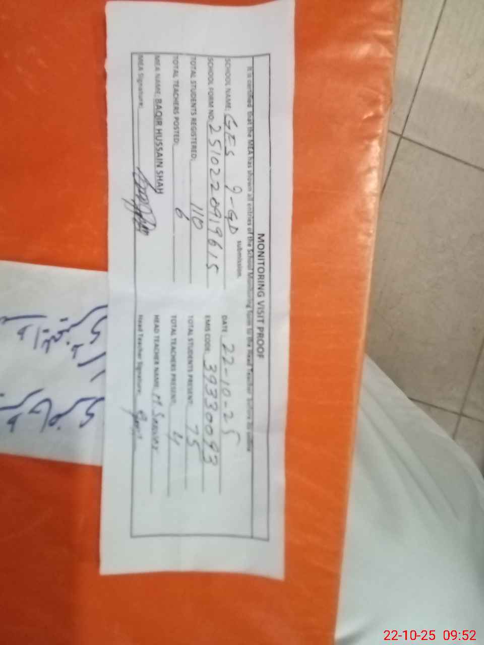 | Attendance Register | Head Teacher | MEA with School | Visit Proof |