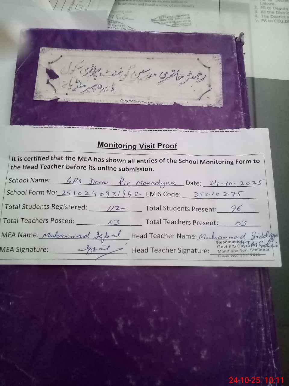 | EMIS Code: 35210275 | Name of School: GPS DERA PIR MANADYNA | |||