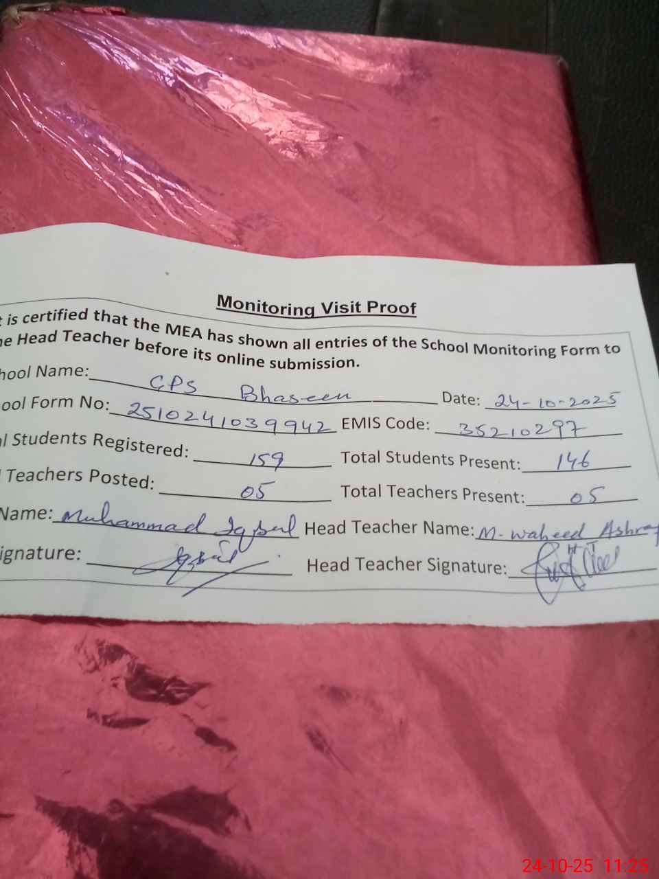 | Certified that this School was Inspected by the Undersigned MEA/DMO Today and the Information Stated Above is as Per Record. | |||||