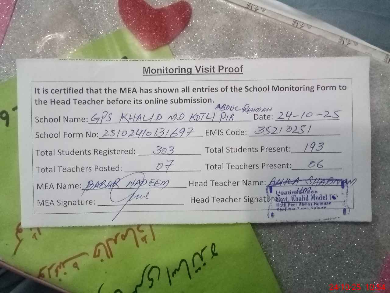| EMIS Code: 35210251 | Name of School: GPS KHALID MODEL KOTLI PIR ABDUL | |||