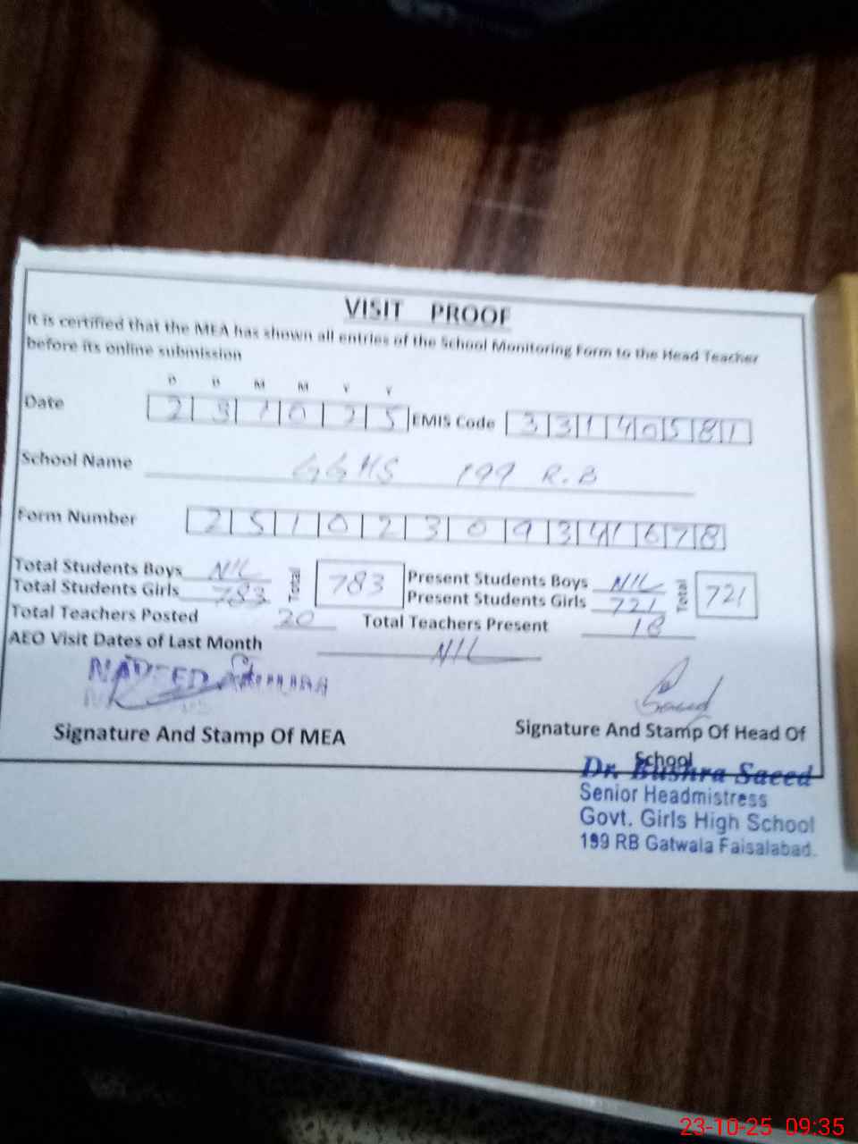 | Certified that this School was Inspected by the Undersigned MEA/DMO Today and the Information Stated Above is as Per Record. | |||||