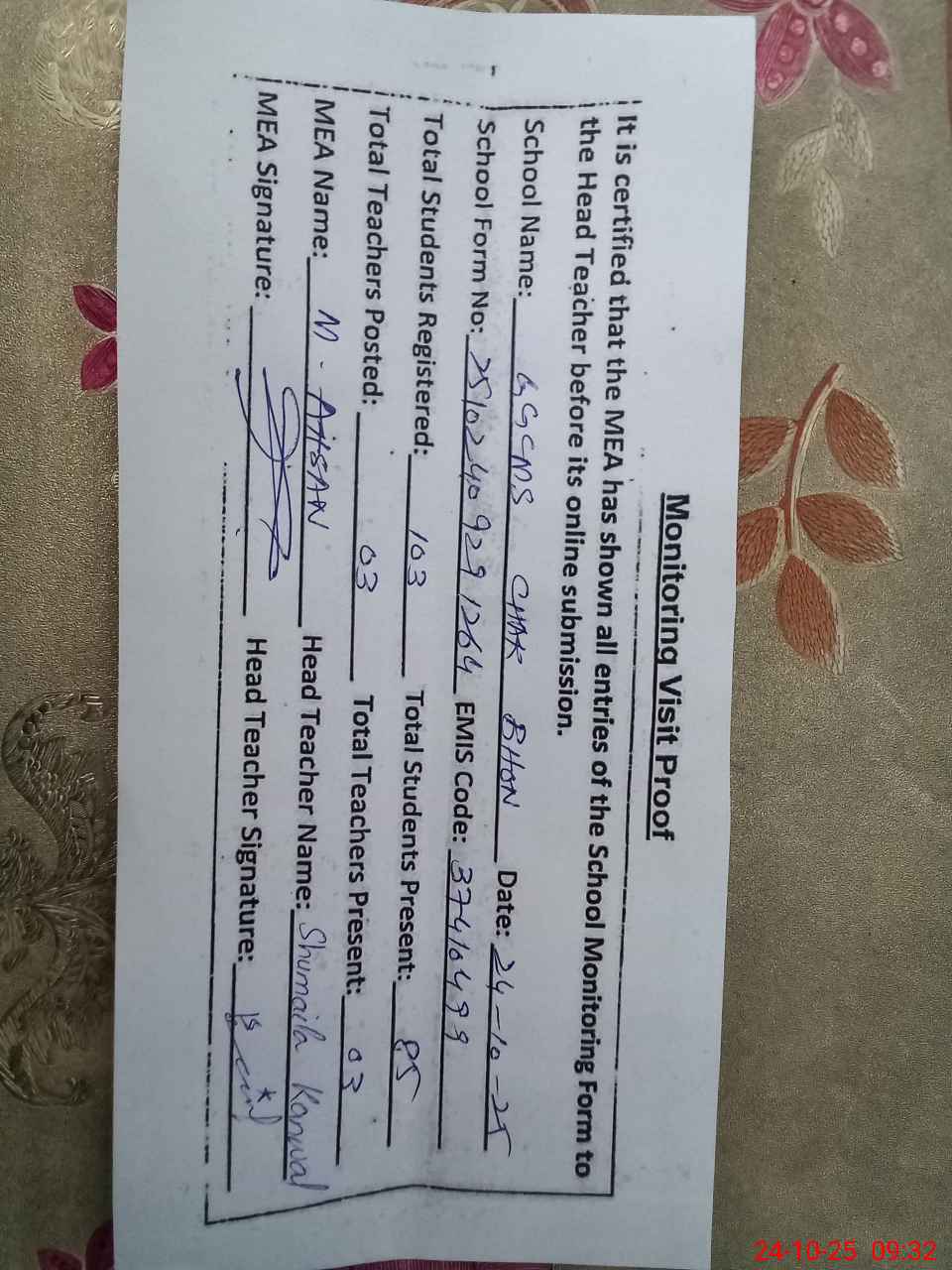 | Attendance Register | Head Teacher | MEA with School | Visit Proof |