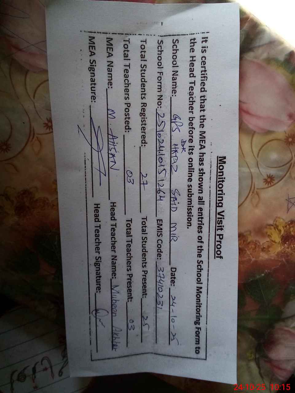 | Certified that this School was Inspected by the Undersigned MEA/DMO Today and the Information Stated Above is as Per Record. | |||||