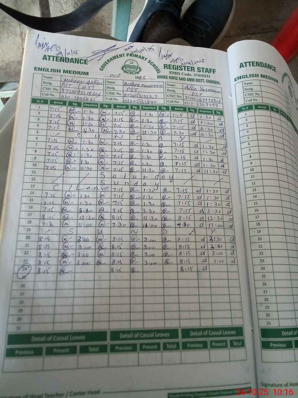| CNIC | Full Name | Designation | R/C | Absence during last cal. month |