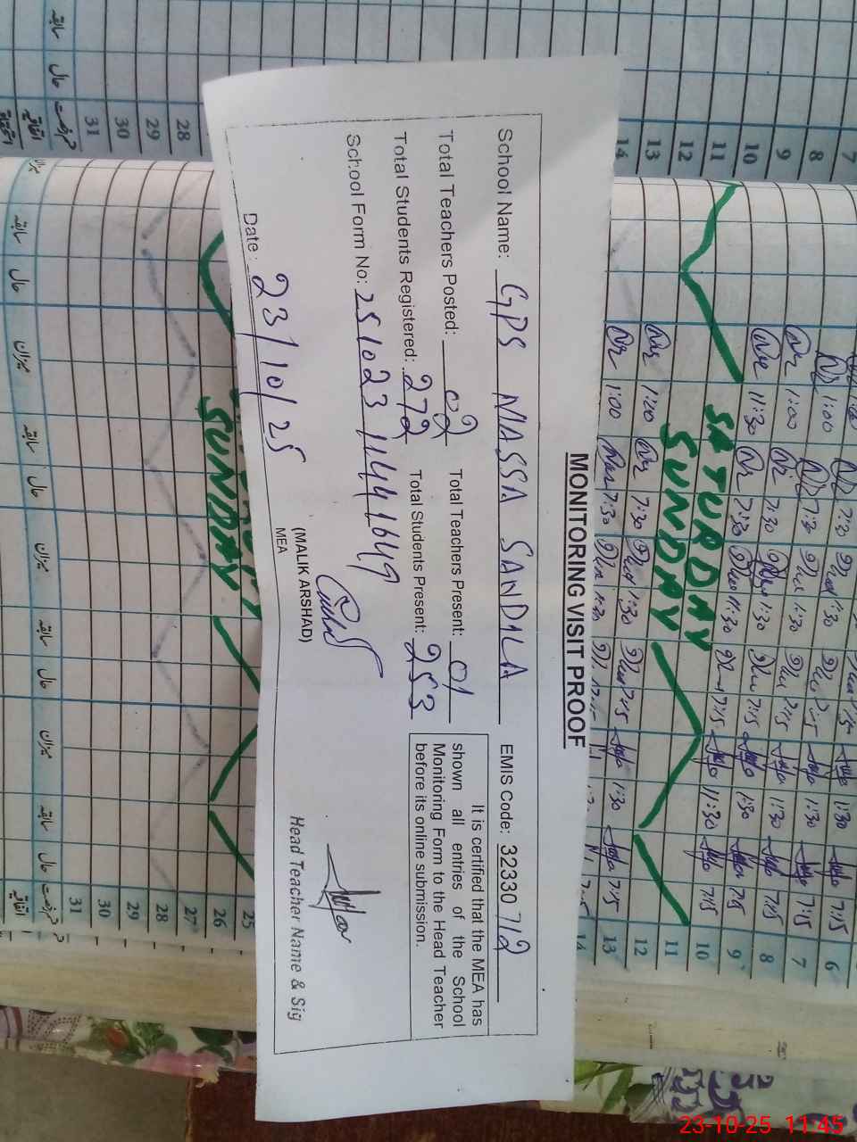 | Attendance Register | Head Teacher | MEA with School | Visit Proof |