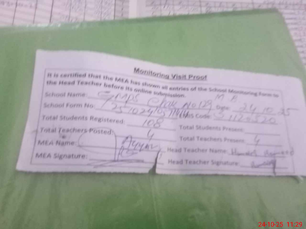 | Attendance Register | Head Teacher | MEA with School | Visit Proof |
