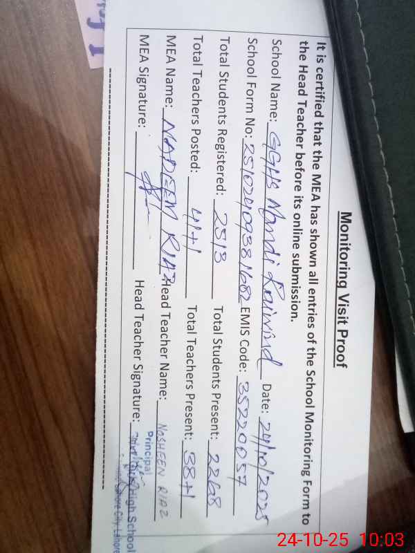 | Remarks (Use Separate Page if Required): EST Qurat ul Ain removed from service since 2024 and accordingly her name removed from SIS as well but she exists in PMIU teachers list for this school This school runs in two separate campuses | |||||