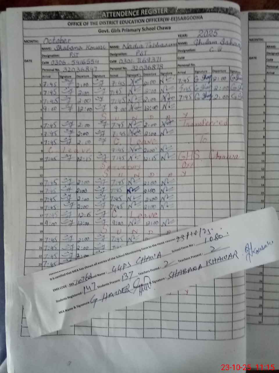 | Name: SH**** KA**** Designation: (School Headmaster's/Headmistress's) PST Phone/Cell Number: 03**** |
