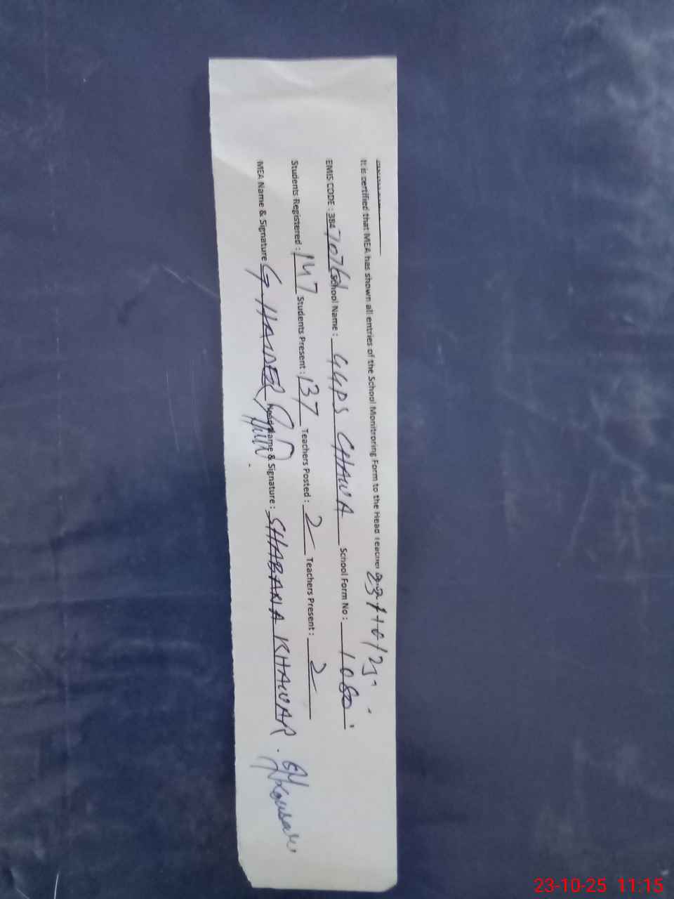| Attendance Register | Head Teacher | MEA with School | Visit Proof |
