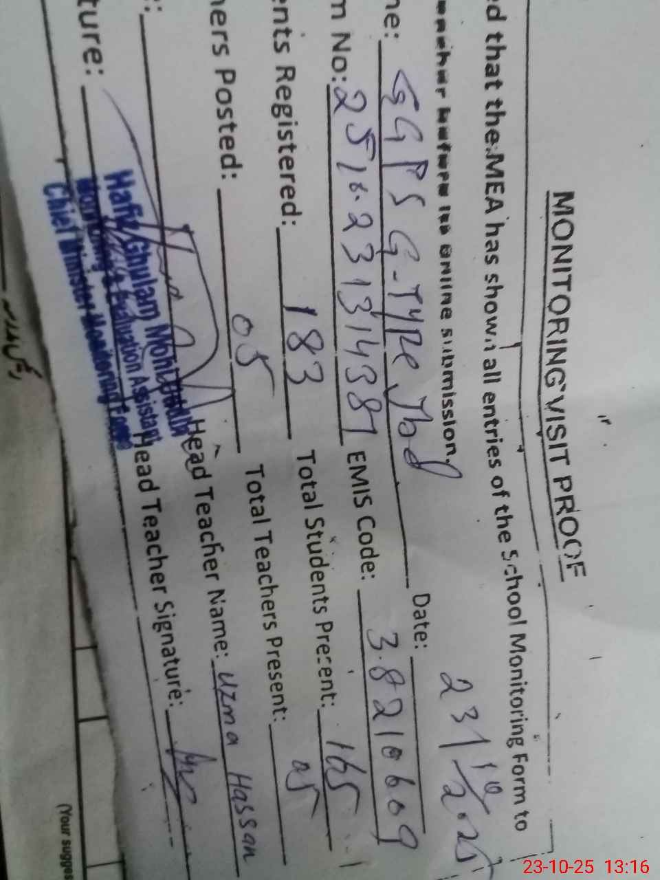 | Name: Uz**** Hu**** Designation: (School Headmaster's/Headmistress's) PTC/PST Phone/Cell Number: 03**** |