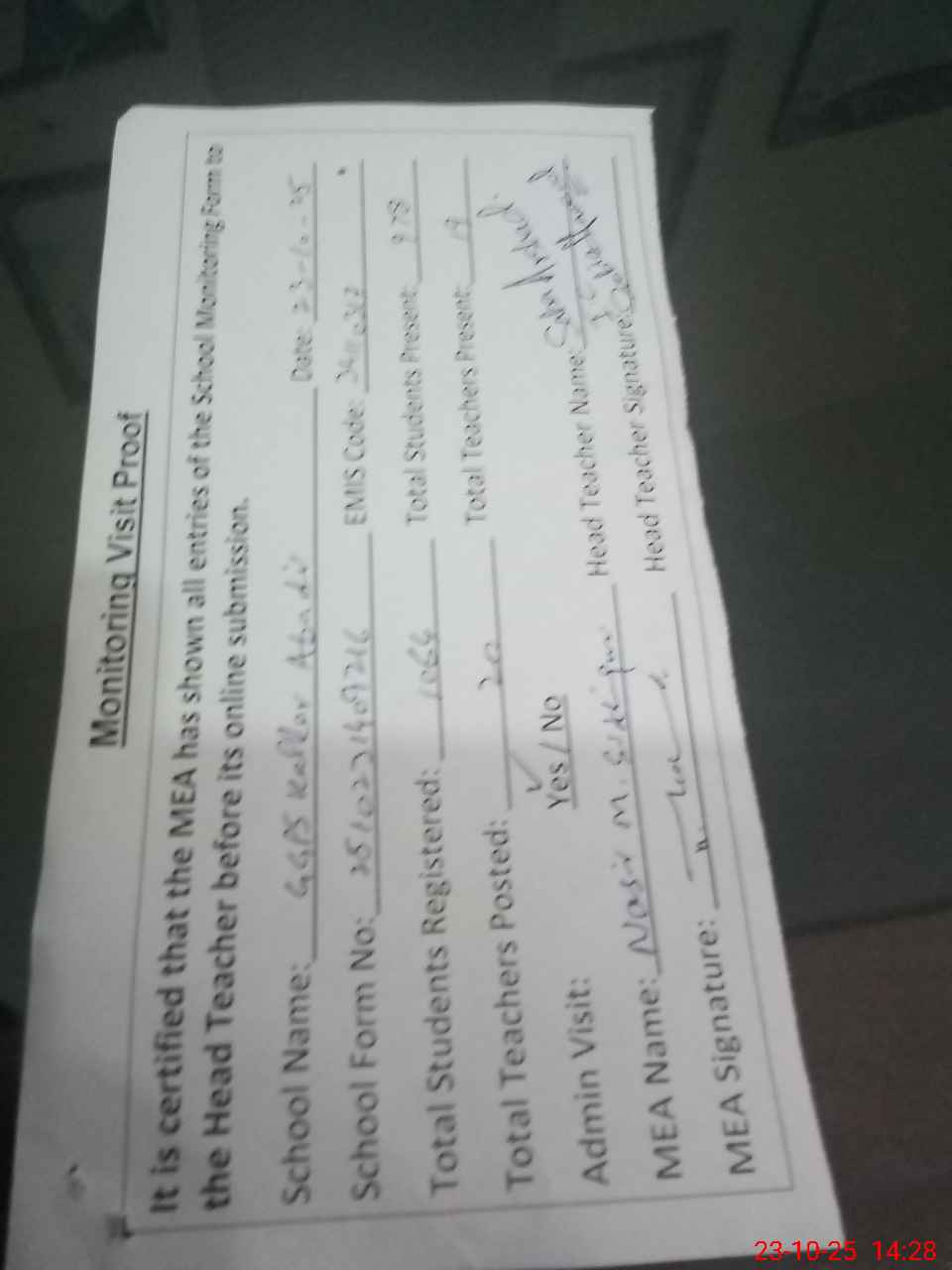 | Attendance Register | Head Teacher | MEA with School | Visit Proof |