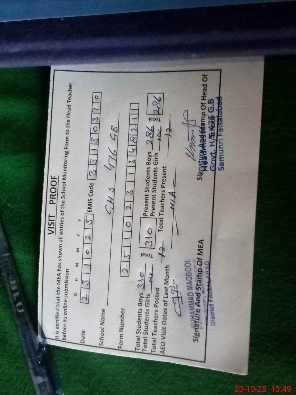 | Certified that this School was Inspected by the Undersigned MEA/DMO Today and the Information Stated Above is as Per Record. | |||||