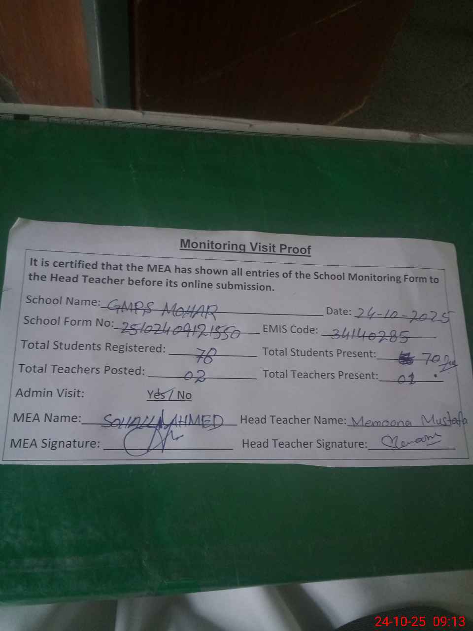 | Attendance Register | Head Teacher | MEA with School | Visit Proof |