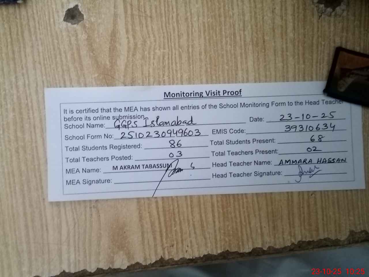 | Monitoring Date: 23-10-2025 | Start Time: 23-10-2025 09:49 AM | End Time: 23-10-2025 10:25 AM | Name of MEA: MU**** AK**** TA**** | |