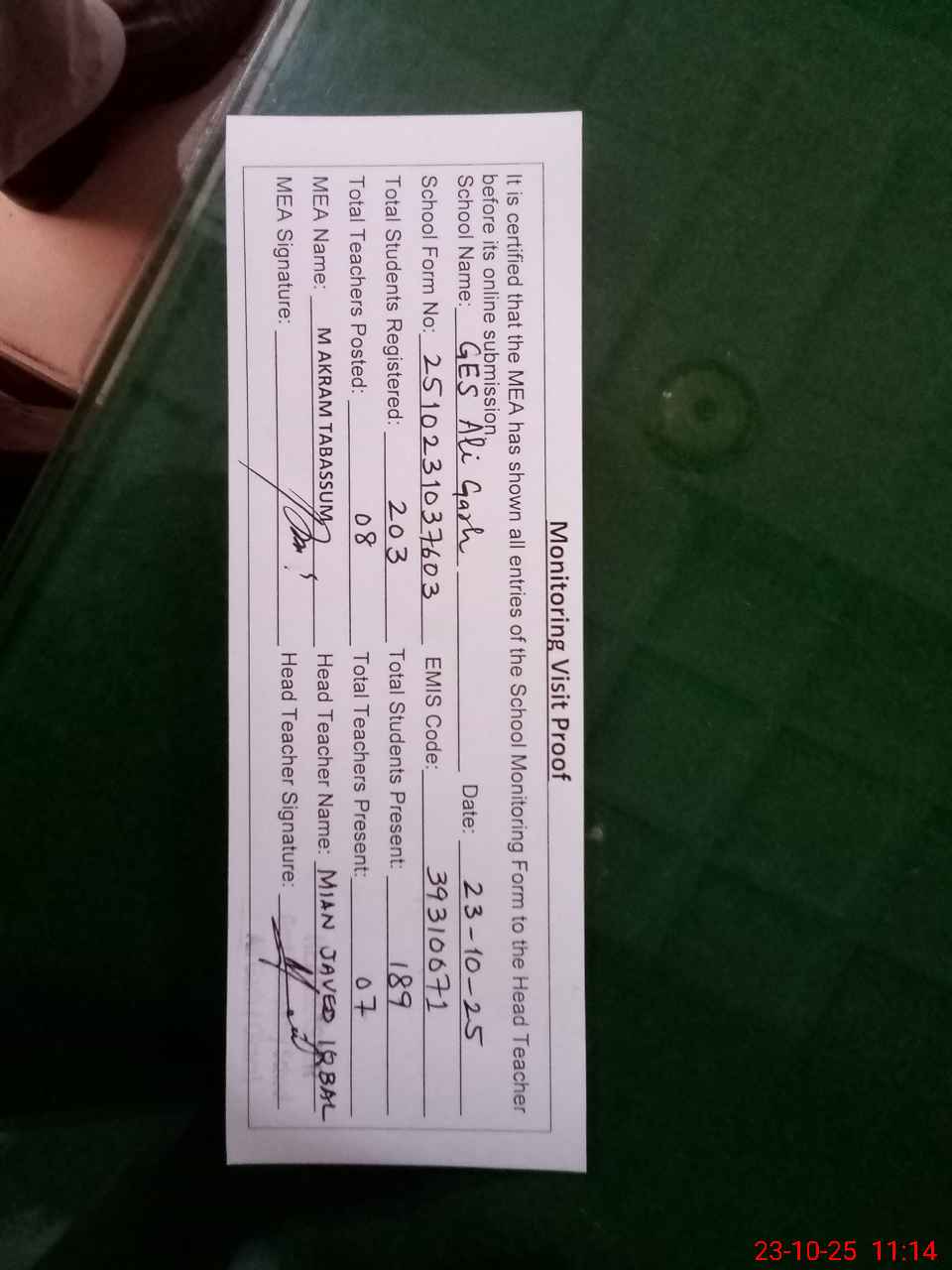 | Attendance Register | Head Teacher | MEA with School | Visit Proof |
