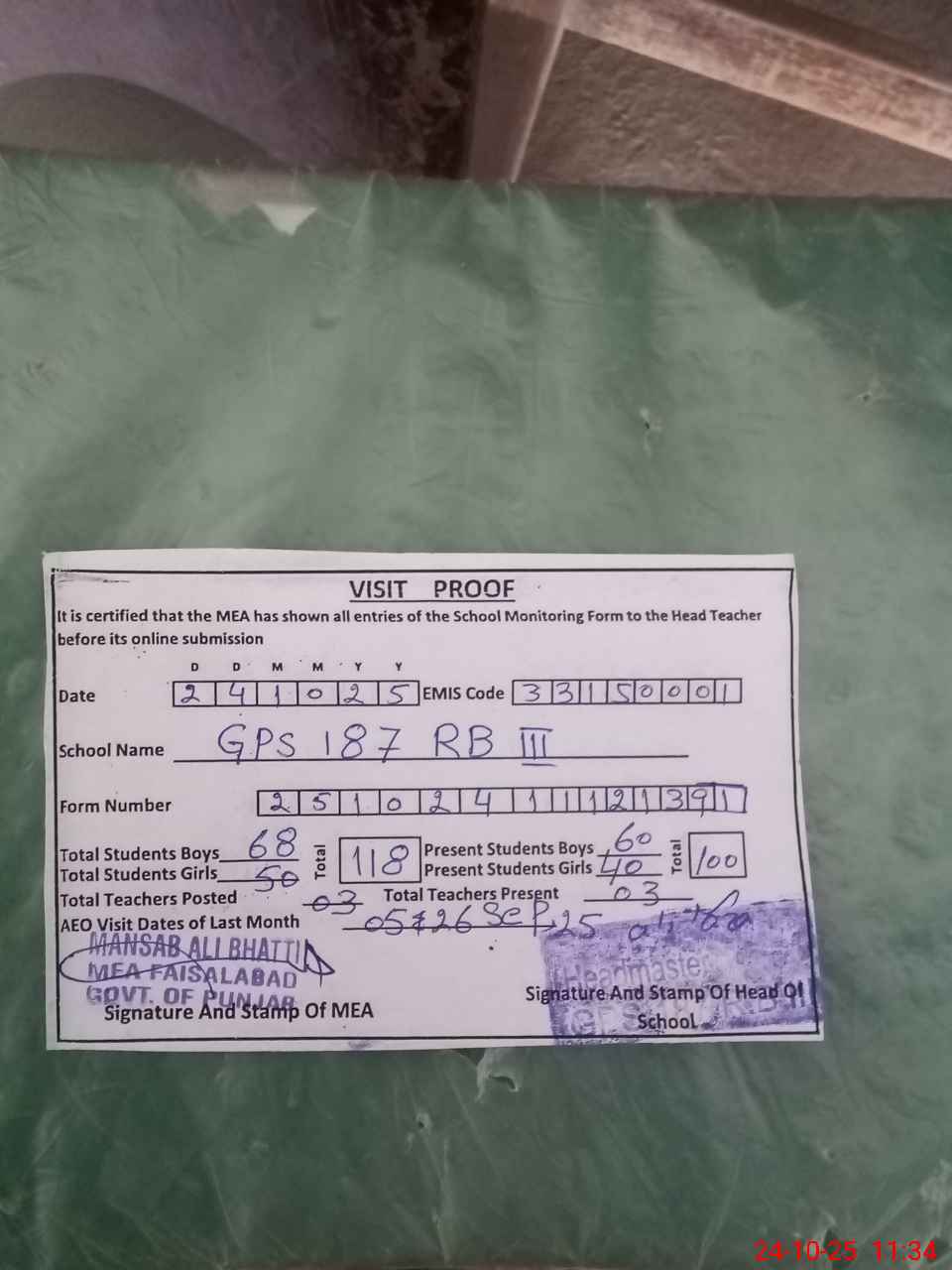 | Attendance Register | Head Teacher | MEA with School | Visit Proof |