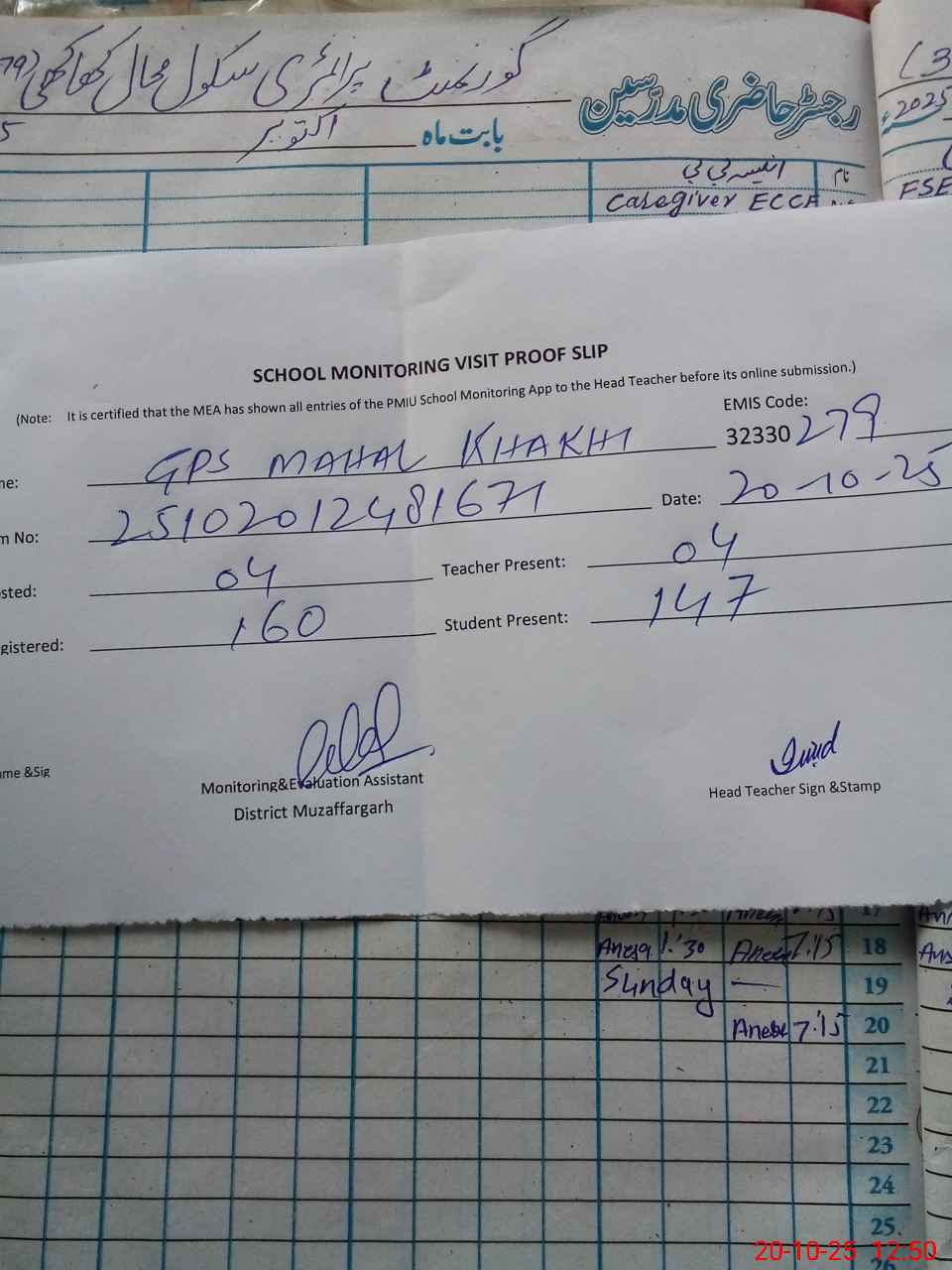 | Attendance Register | Head Teacher | MEA with School | Visit Proof |