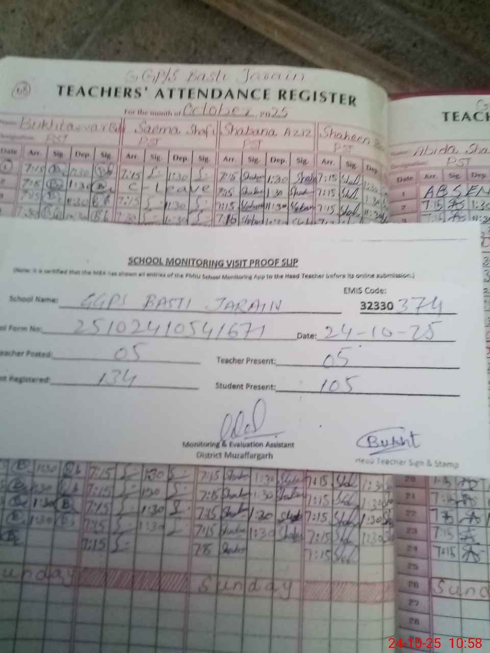 | Attendance Register | Head Teacher | MEA with School | Visit Proof |