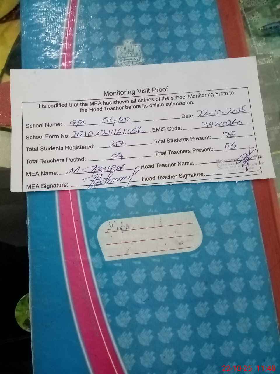 | Attendance Register | Head Teacher | MEA with School | Visit Proof |