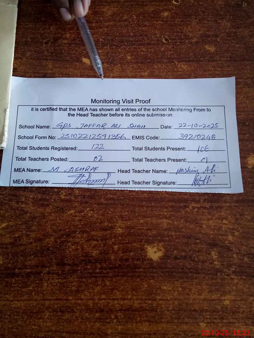 | Attendance Register | Head Teacher | MEA with School | Visit Proof |