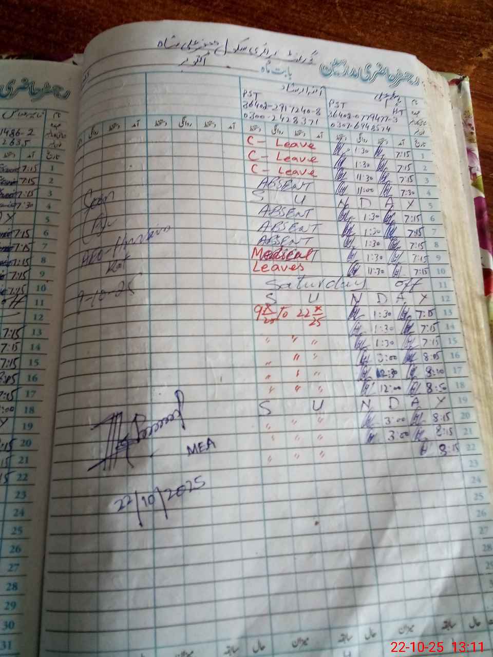 | CNIC | Full Name | Designation | R/C | Absence During Last Calender Month |