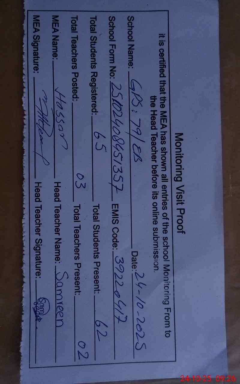 | EMIS Code: 39220417 | Name of School: GGPS 79 / EB NO.2 KORAN WALI BASTI P.O 69 EB | |||