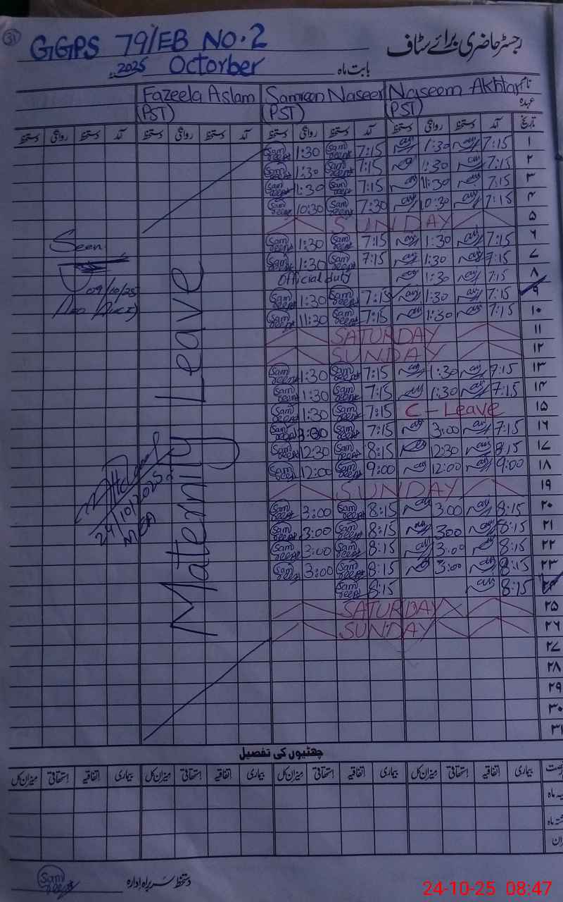 | 36**** | Fa**** Aa**** | PST | Regular | 11 | 0 | 0 | 8 | 0 | 0 | 0 | 0 | 3 | Maternity |