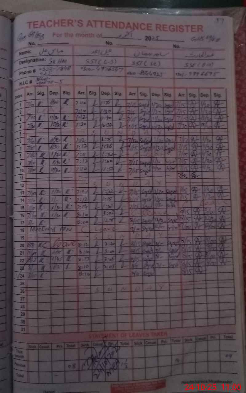 | Name: AB**** AL**** Designation: (School Headmaster's/Headmistress's) SNR H M Phone/Cell Number: 03**** |