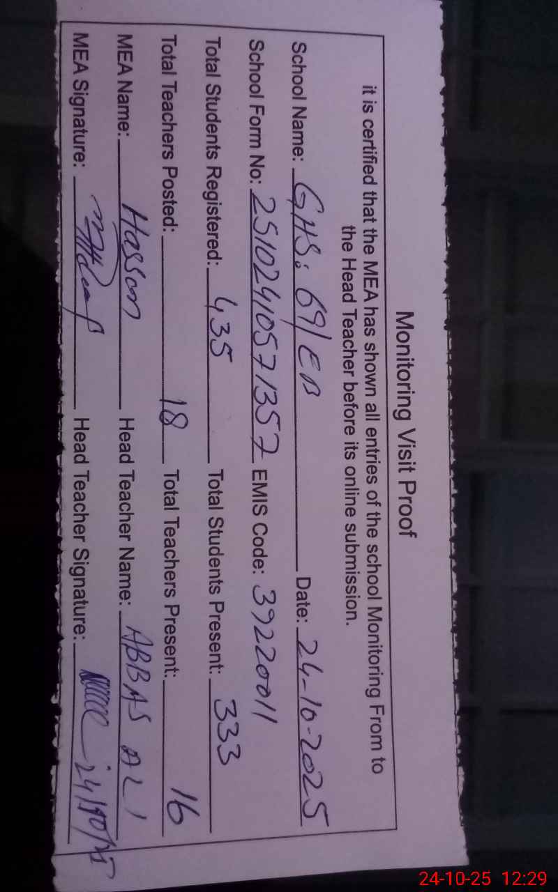 | EMIS Code: 39220011 | Name of School: GHS 69/EB ARIF WALA | |||