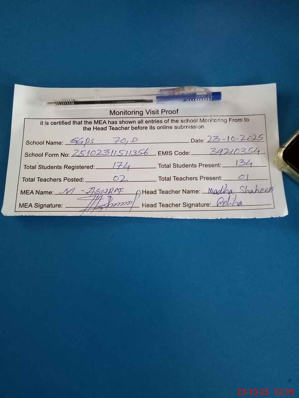 | EMIS Code: 39210354 | Name of School: GGPS 70 D | |||