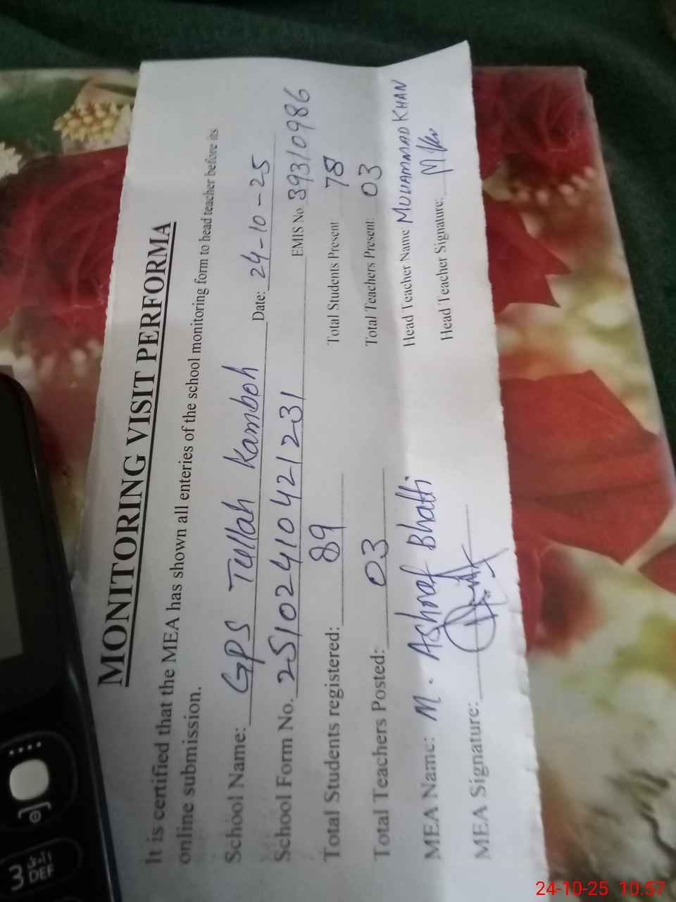 | Name: MKH**** Designation: (School Headmaster's/Headmistress's) PST Phone/Cell Number: 03**** |