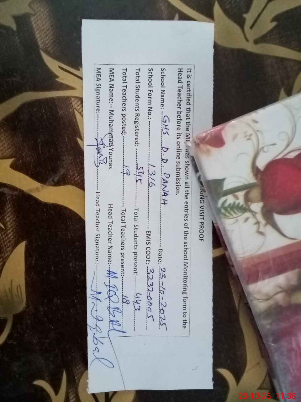 | Attendance Register | Head Teacher | MEA with School | Visit Proof |