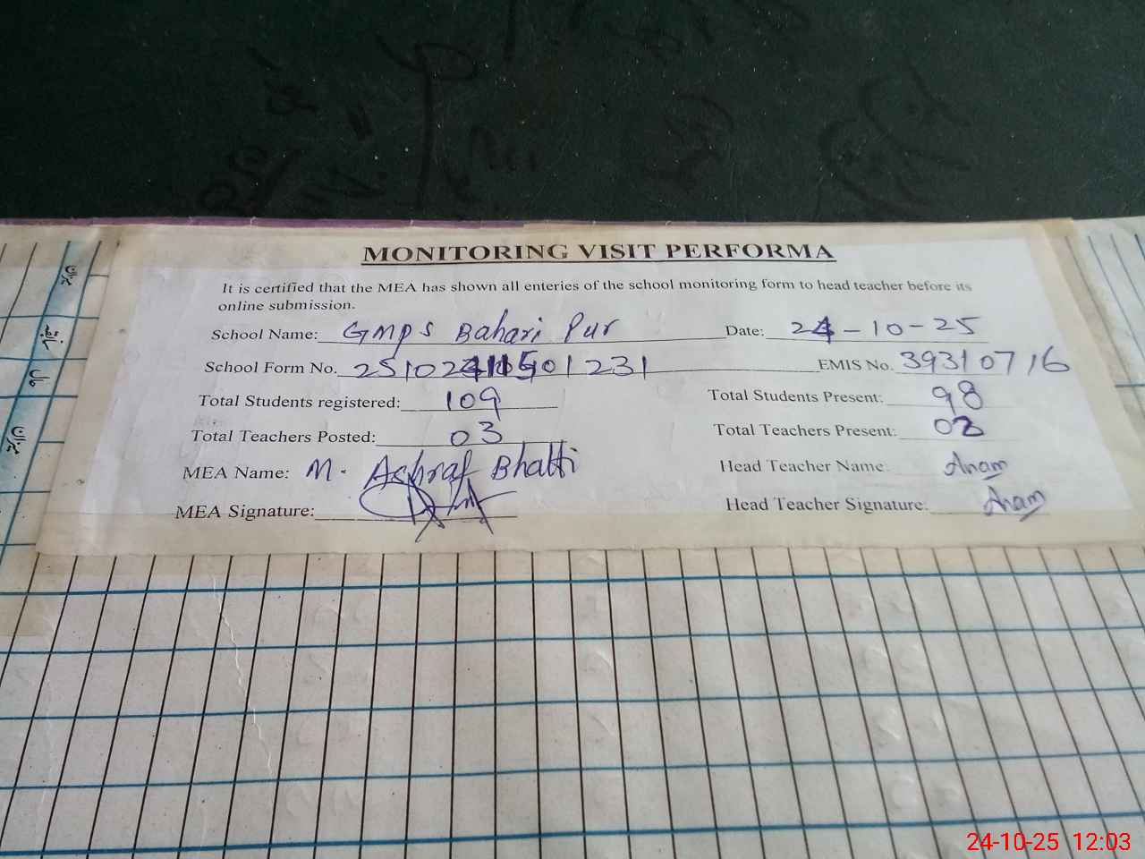 | EMIS Code: 39310716 | Name of School: GMPS BAHRI PUR | |||